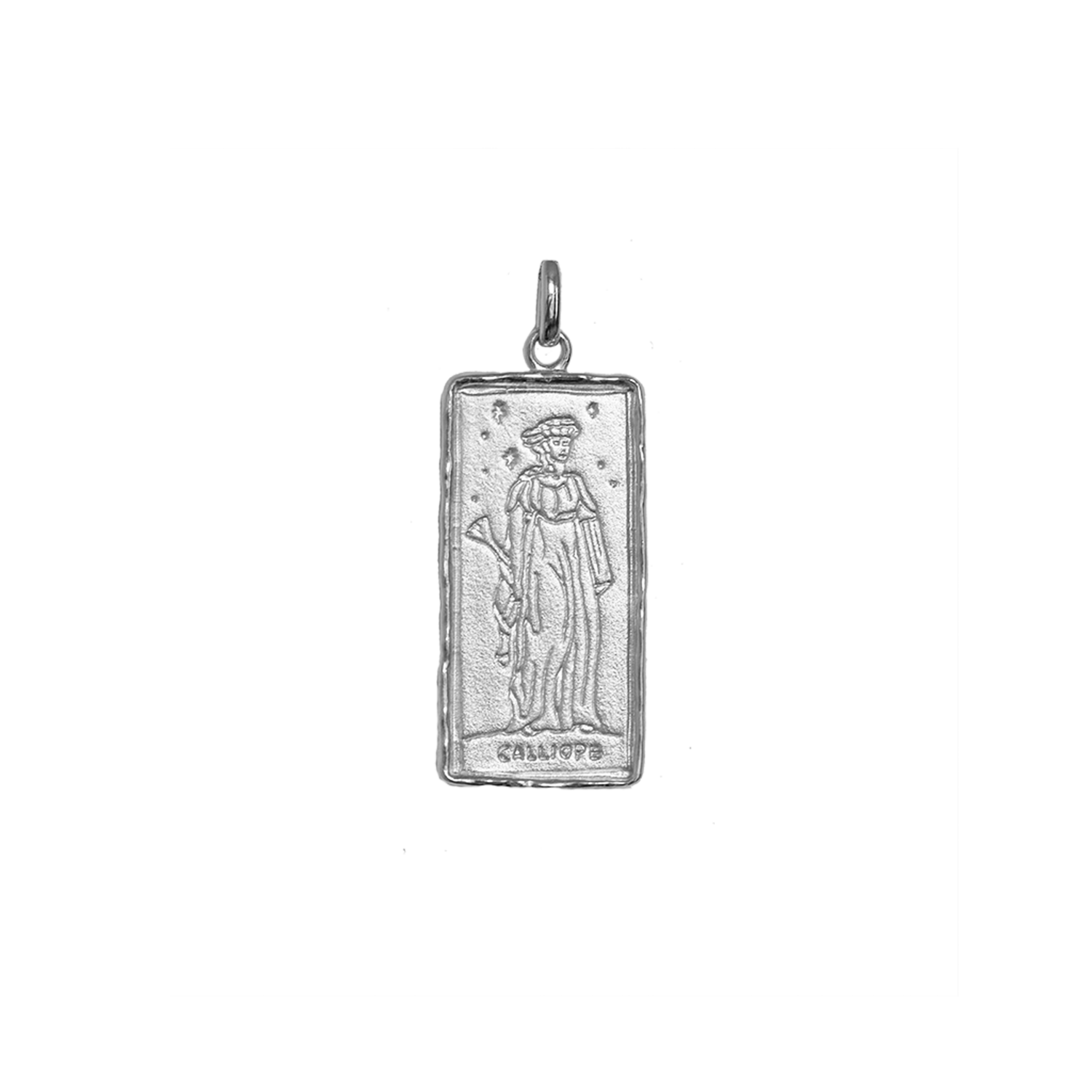 As the muse of the written word, Calliope is most often pictured with her stylus, a paper scroll or a book. This handcrafted pendant depicts Calliope in an original etching from 1832, accompanied by her book and lyre.
