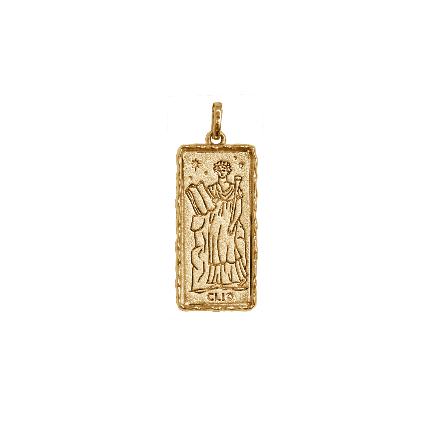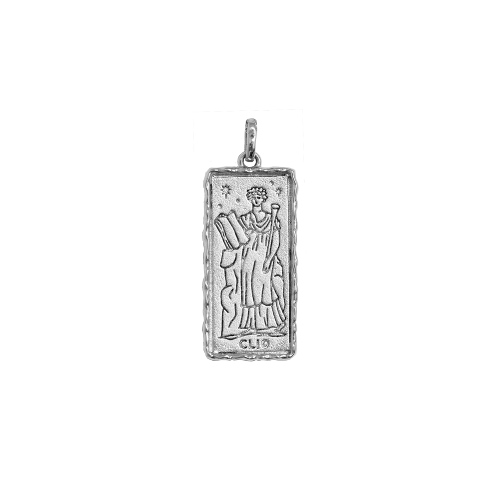As the muse of history, Clio is most often pictured with a book or parchment, a laurel crown and a lyre. This handcrafted pendant depicts Clio in an original etching from 1832, accompanied by all three of her symbols.