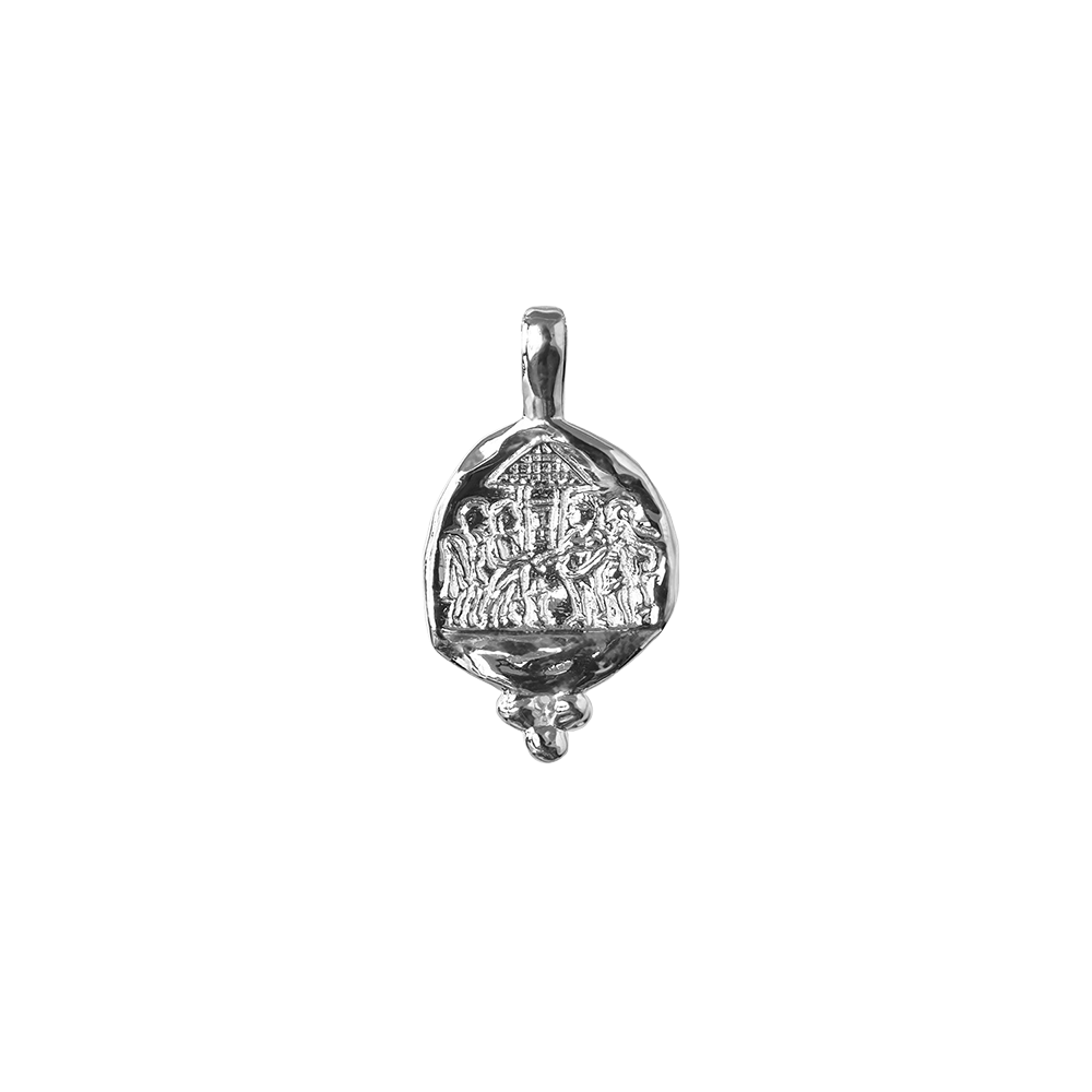 This solid gold pendant is based on a rare Roman coin that depicts Vestals sacrificing at the Temple of Vesta, to which I’ve added detail and granulation, mimicking the Etruscan style.